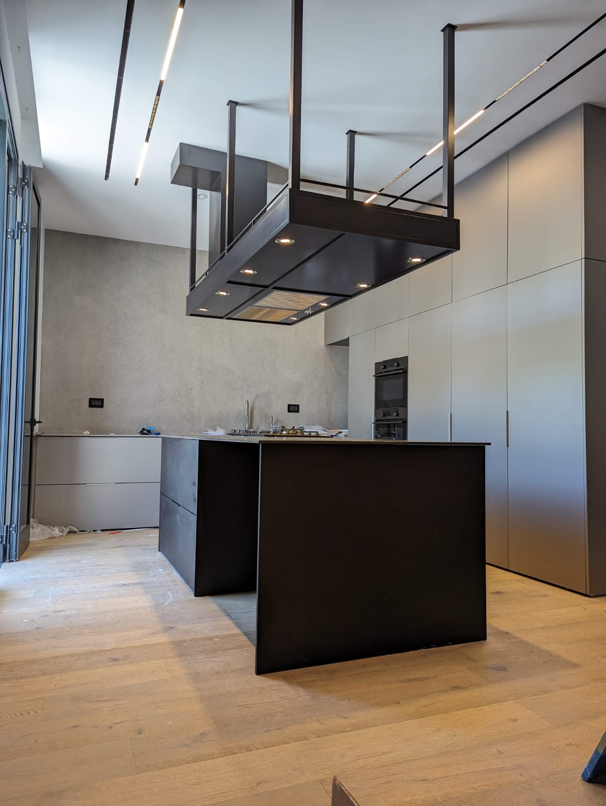 - עיצוב מינימליסטי ומודרני: קווים גיאומטריים נקיים המשתלבים בהרמוניה עם ארונות המטבח וחיפויי הקיר.