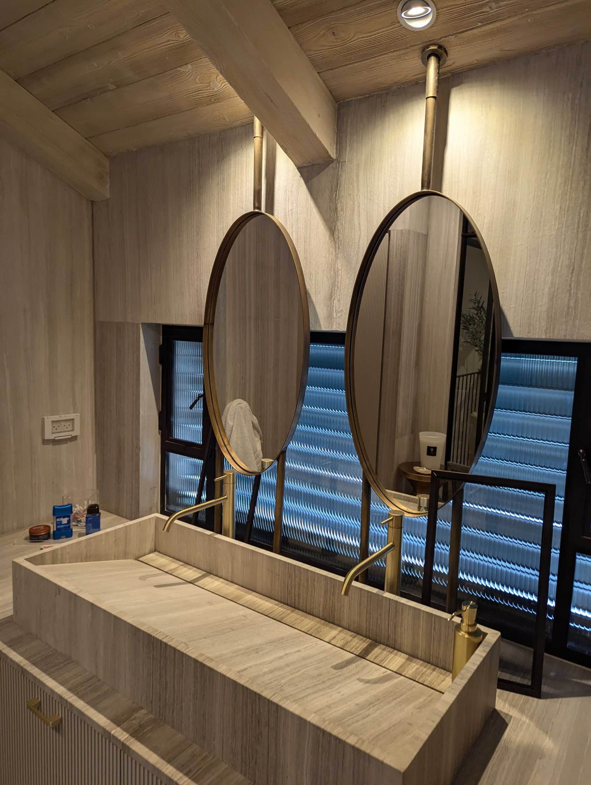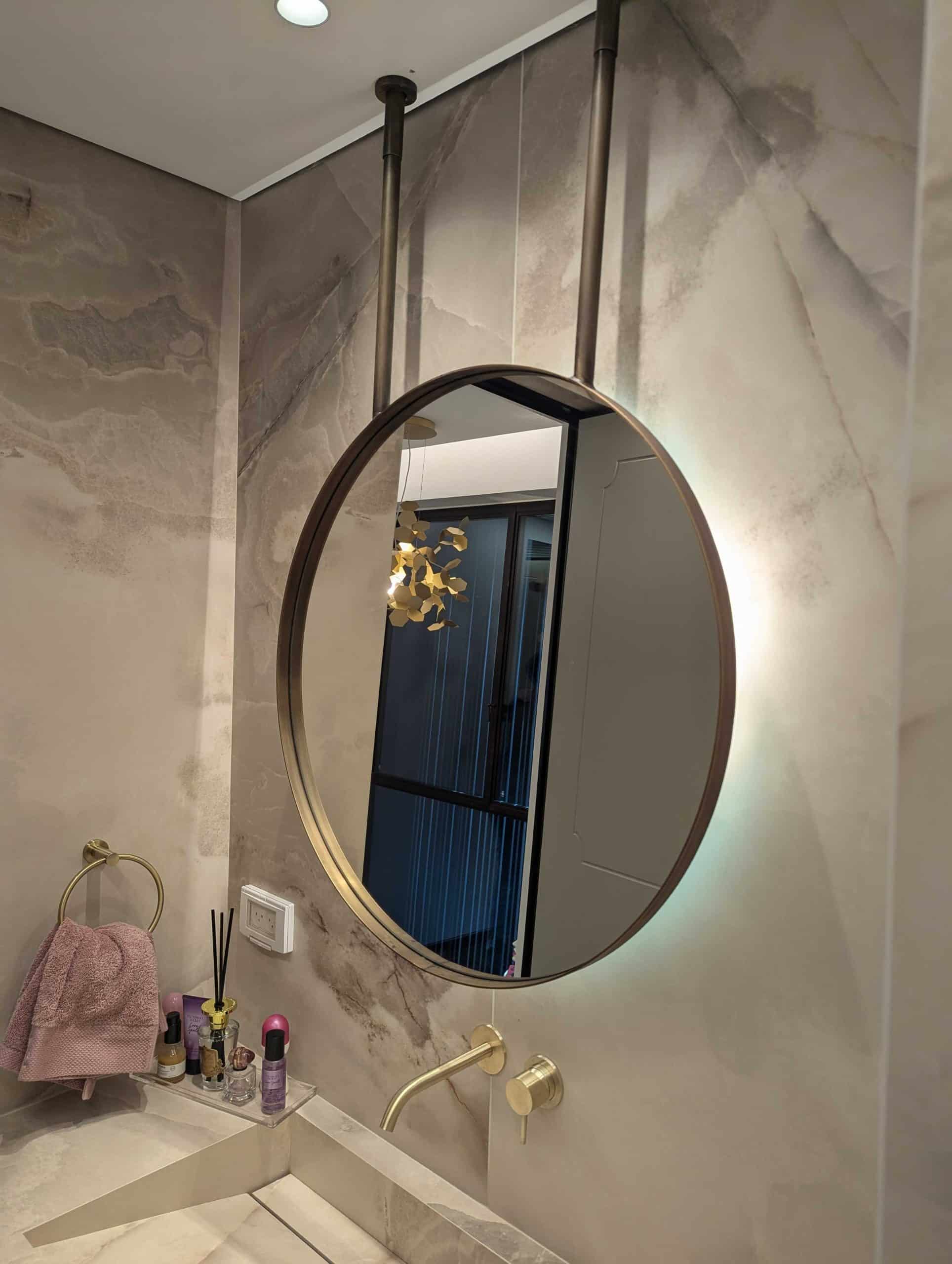 מראות אובליות ומראות עגולות עם מסגרות פליז מדויקות, משרביה מפליז בעבודת-יד שמעניקה עומק ואופי לחלל הסלון, וקונסולת פליז יוקרתית המשמשת כפריט אומנות פונקציונלי.